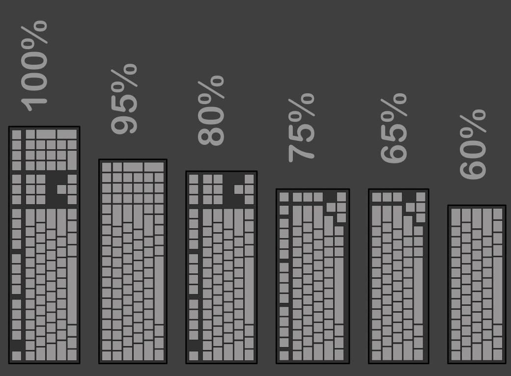 Cases can not only affect the sound of a keyboard, albeit less than switches or keycaps, but they can change the look and functionality massively. This is because the shape of the case you pick out will determine the layout of your keyboard! There exist many different layouts for keyboards but the most common are the 100%, 80%/Tenkeyless, 65%, and a 60%. each of these are shown down below.